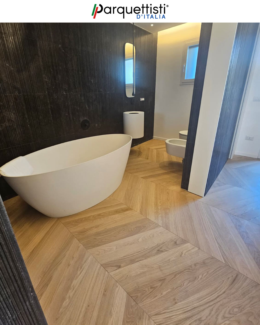 Posa in bagno di parquet prefinito in rovere a spina ungherese