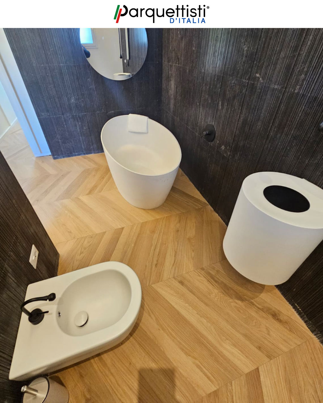 Alessandro presenta in queste foto un bagno di design dove il parquet in rovere prefinito è protagonista assoluto. La posa a spina ungherese, con le sue linee geometriche precise, esalta la luminosità del legno naturale contrapponendola alle pareti scure texturizzate. Questa scelta materica garantisce resistenza all'umidità e un'estetica ricercata, ideale per trasformare la zona bagno in uno spazio accogliente e moderno.