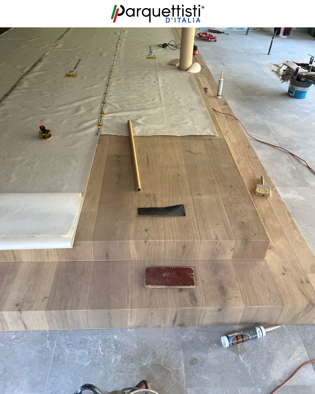 - Progettazione e rivestimento di pedane a due livelli interamente in parquet di rovere;