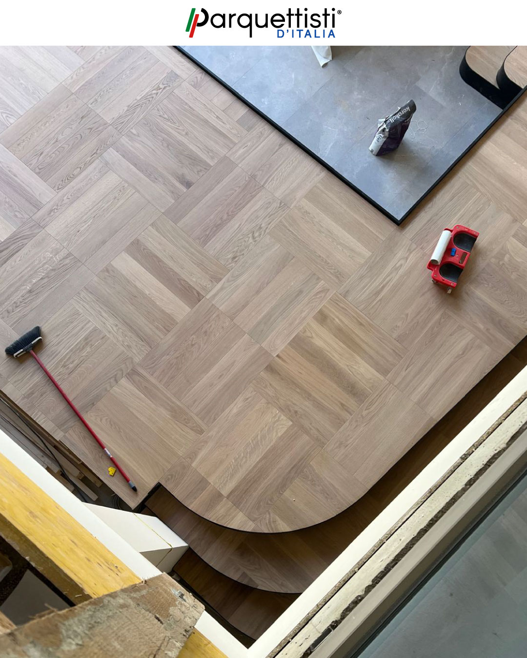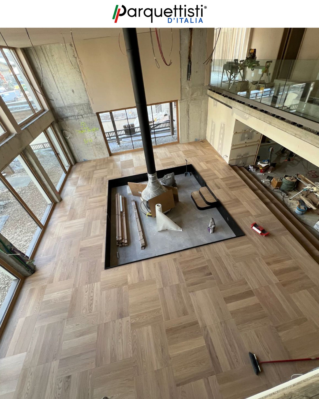 In questo prestigioso cantiere a Bolzano, Besmir esegue una posa magistrale a quadrotte in rovere di prima scelta. L'intervento si distingue per la complessità dei raccordi, realizzati con tagli curvi e profili su misura attorno agli elementi architettonici portanti e alla zona camino. Il risultato è un pavimento geometrico impeccabile che esalta la modernità dello spazio, coniugando precisione tecnica e calore naturale.