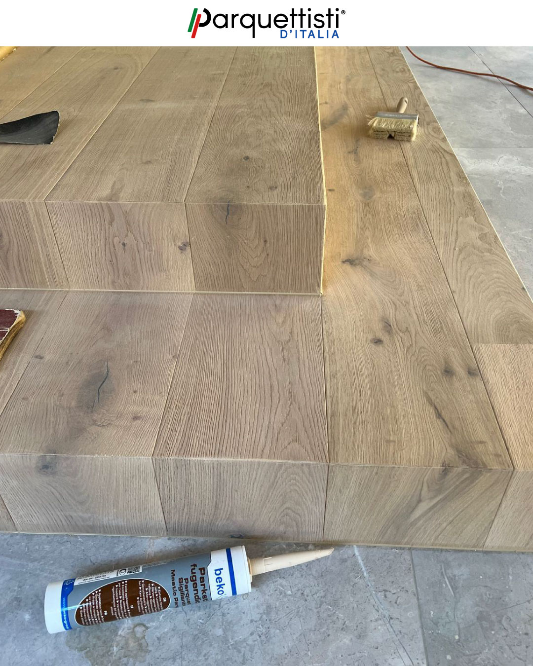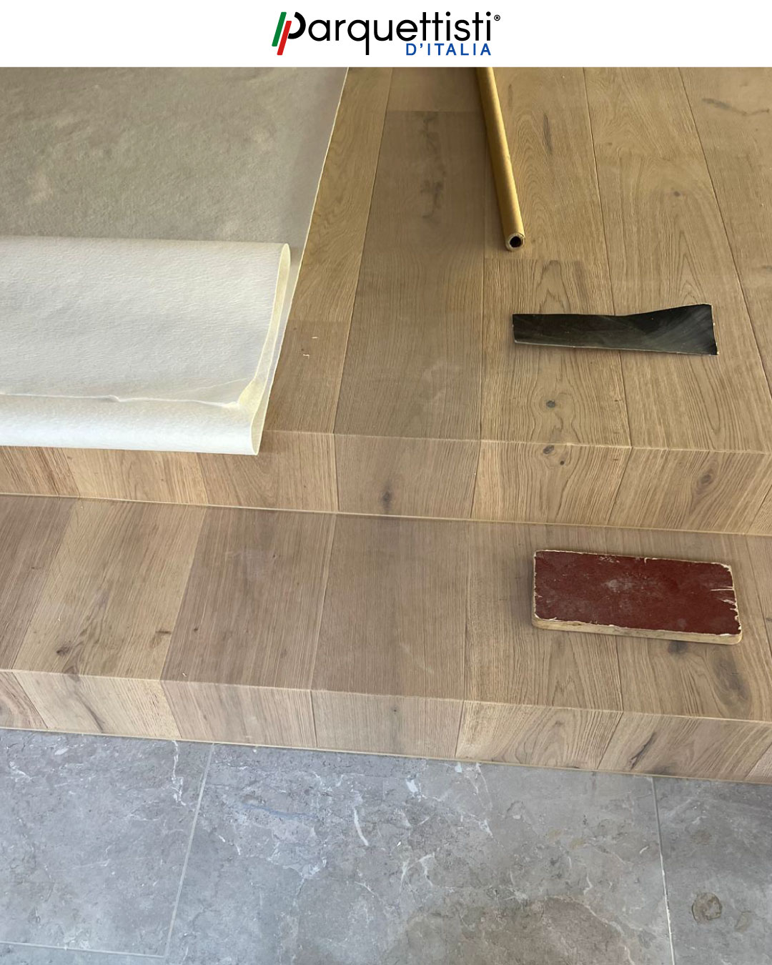 Besmir in queste fotografie mostra una complessa pedana a due livelli interamente rivestita in parquet di rovere. L'intervento ha trasformato l'architettura dell'ambiente, utilizzando gradini in legno coordinati per collegare le diverse quote con eleganza. La cura artigianale nei tagli e negli accostamenti assicura un risultato solido e di grande impatto estetico, dove la matericità del rovere diventa l'elemento d'arredo principale.