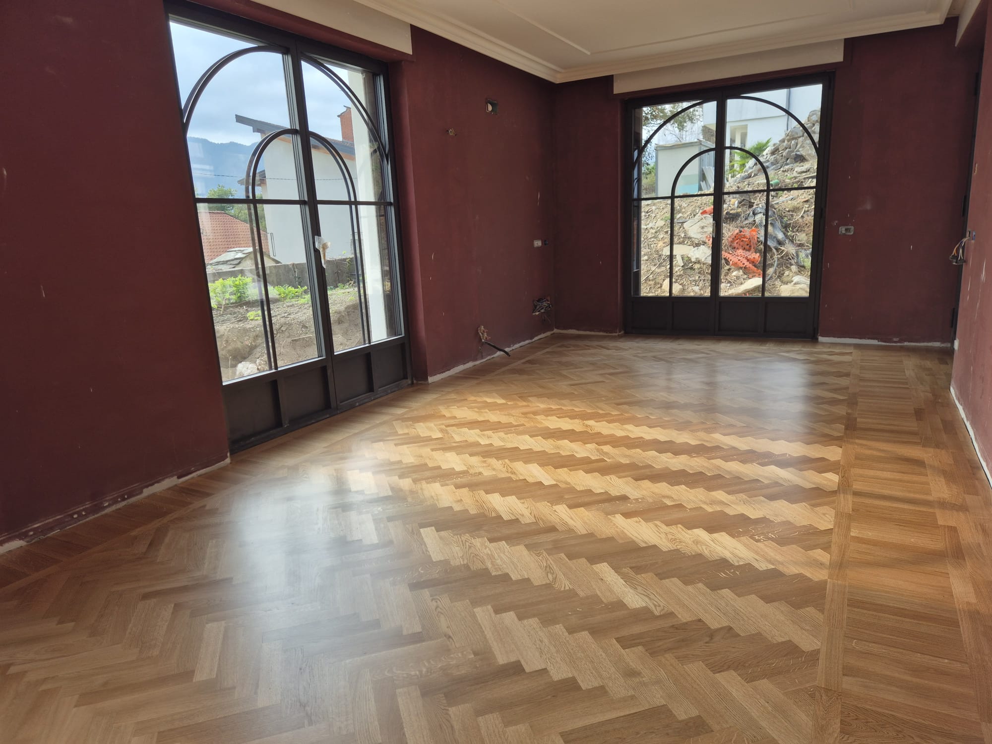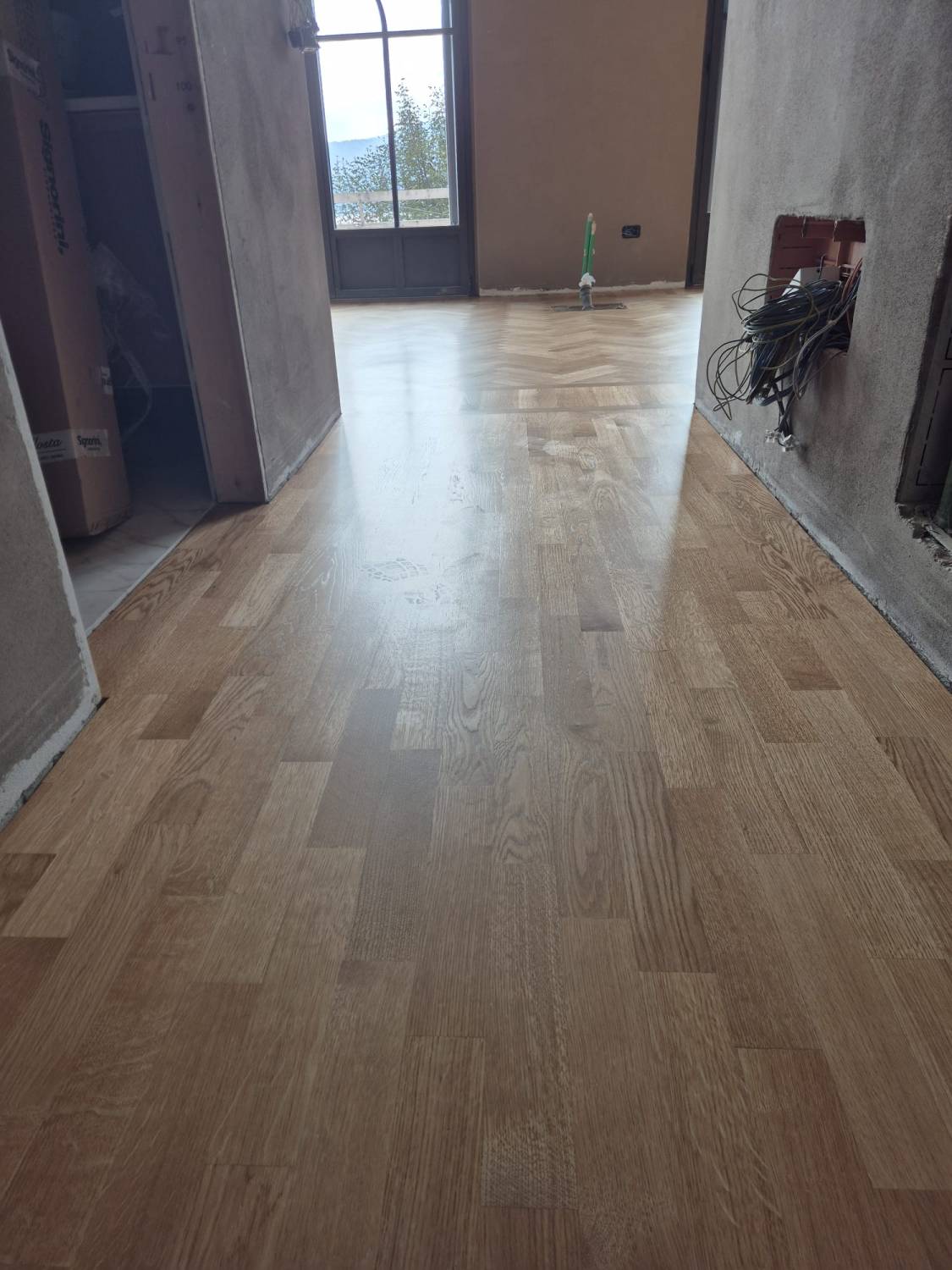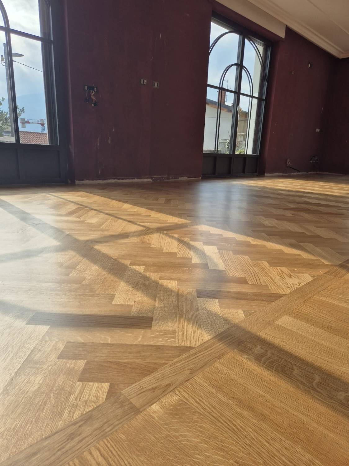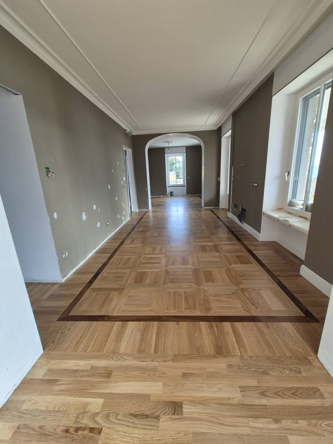Ammiriamo in queste foto la perfetta riuscita di un recupero iniziato da una sapiente asportazione della vecchia vernice che mostrava i segni e i graffi del tempo, per poi livellare con diversi tipi di macchinari di ultima generazione il legno fino a riportarlo alla sua naturale integrità iniziale. Da questo punto dove necessario si è proceduto con la stuccatura dei punti dove il legno aveva aperto fessure per poi usare macchinari più leggeri per la carteggiatura. Una volta livellata la superficie del legno senza segni lasciati dalle varie carte abrasive usate nella lamatura, si è finito il lavoro con più mani di vernice da pavimento in legno applicata in vari strati: e qui non possiamo che ammirare la qualità del lavoro fotografato contro luce e con iper illuminazione, cosa che metterebbe in risalto tutti gli eventuali difetti di sormonto di vernice o di irregolarità nella carteggiatura della vecchia vernice.