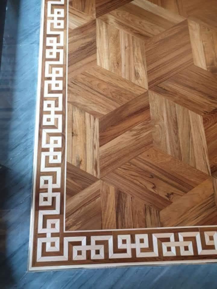 Come non intuire la meravigliosa finitura che questi parquet complessi e di grande impatto estetico e la complessità del lavoro che sta dietro ad un lavoro tanto raffinato: la parte difficile è sicuramente il montaggio di questi parquet tanto sofisticati e complessi da doghe e plance di formati e dimensioni diverse che vanno a formare uno specifico disegno, un arabesco, un vero e proprio mosaico che poi una volta incollato a terra deve essere levigato e riportato in piano perfettamente liscio. Quindi se non si tratta di parquet prefinito, il pavimento in legno va stuccato e di nuovo carteggiato, e questo comporta tempi di meticolosa attesa e attenta procedura, non ci deve essere fretta nè urgenza quando si eseguono certi lavori di precisione, perchè altrimenti si mettono a rischio la perfezione e la miglior riuscita delle fasi successive di verniciatura del parquet e la relativa finitura liscia e priva di imperfezioni. Si deve fare attenzione a lavorare sempre in assenza di polvere e con calzari specifici per evitare di lasciare impronte sotto la vernice.
