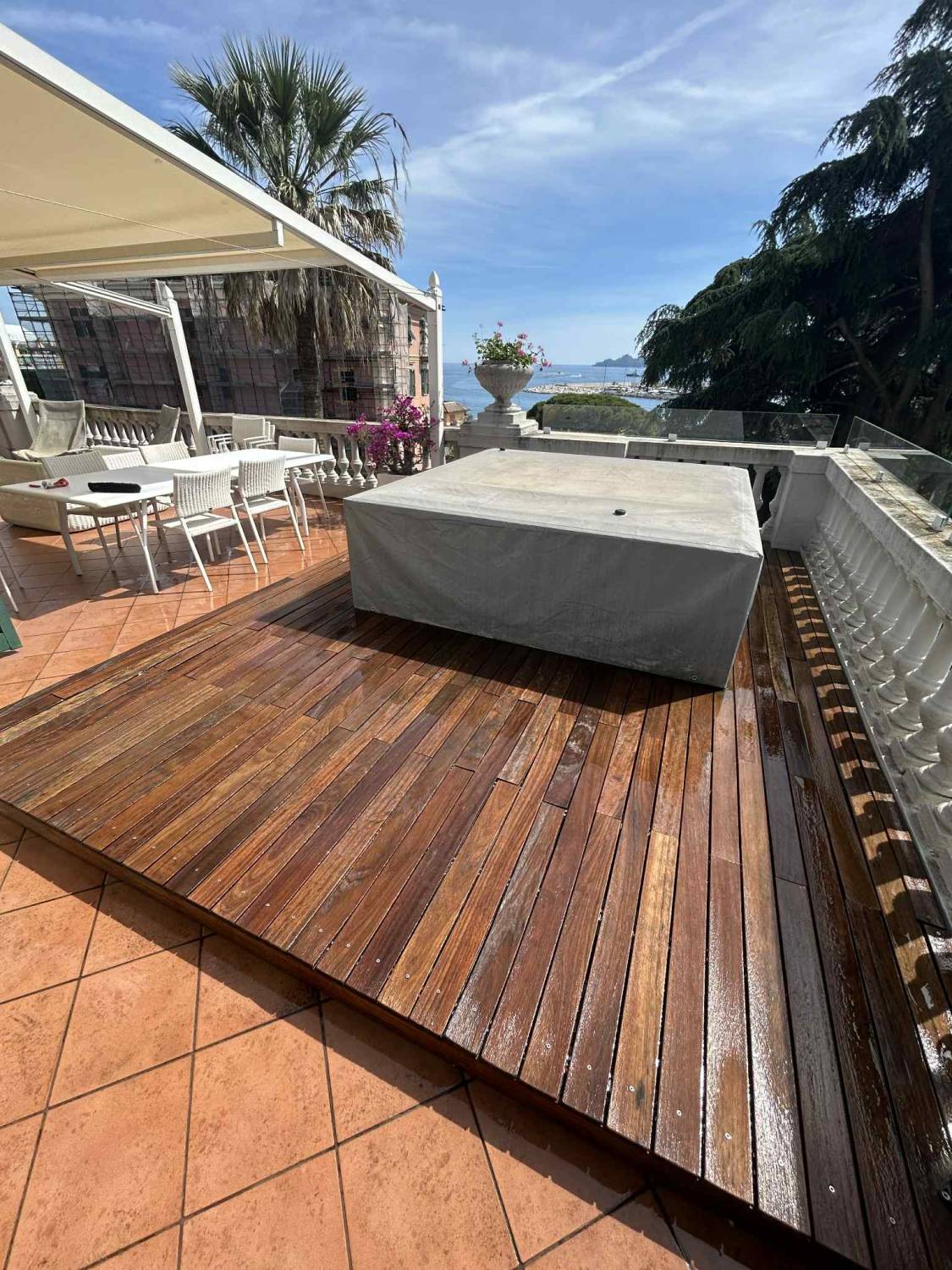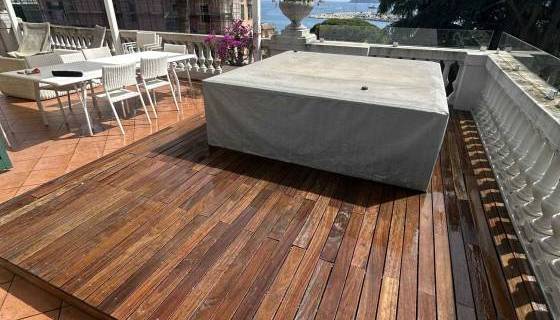 Grazie alle voto gentilmente messe a disposizione dal nostro parquettista possiamo mostrare non solo il prima e il dopo di un trattamento di manutenzione di una padena in legno da terrazzo, ma anche una costruzione in legno di copertura realizzata sui gradini di una scala partendo dalle stesse doghe di parquet prefinito usato per la posa in tutto il resto della casa in un appartamento di Savona.